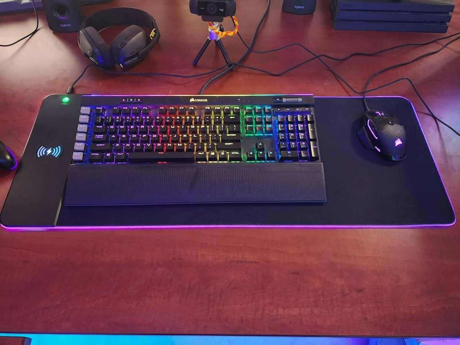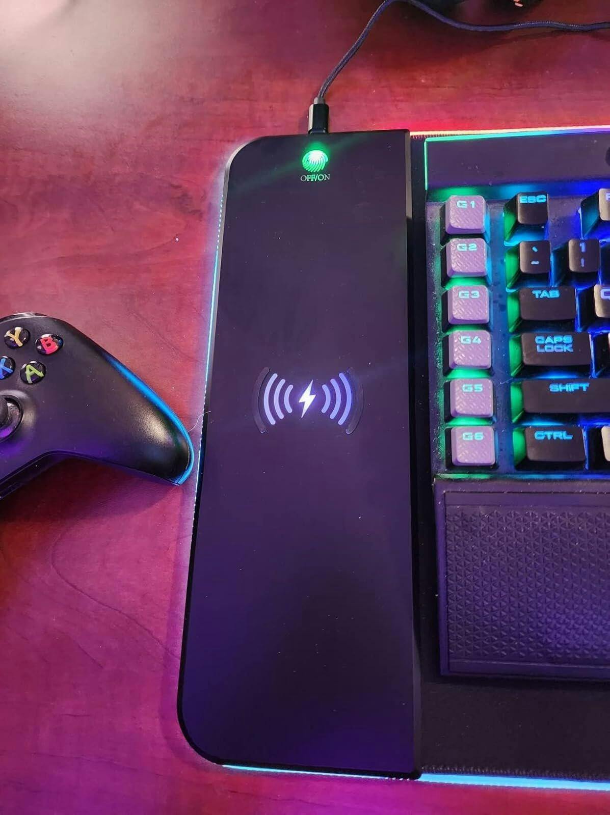 I like this matt for my desk and the wireless charger built in is something I have been looking for. For the charger part of it im not sure why but they have added little legs to it. My phone case is pretty thick and works with most chargers but these legs make it so I am not able to charge it without taking my case off. Im thinking about maybe carefully removing them and see if it will cahrge my phone. I like that it has several different solid colors to choice from as well as rainbo RGB