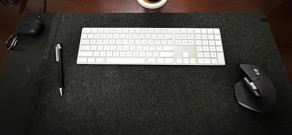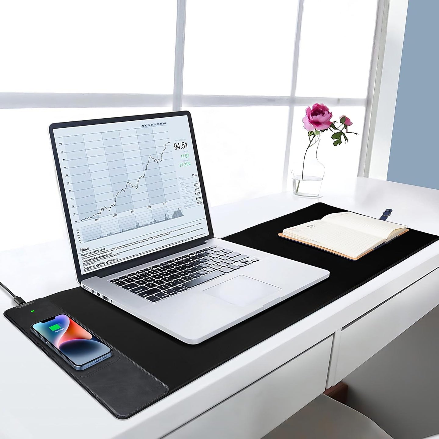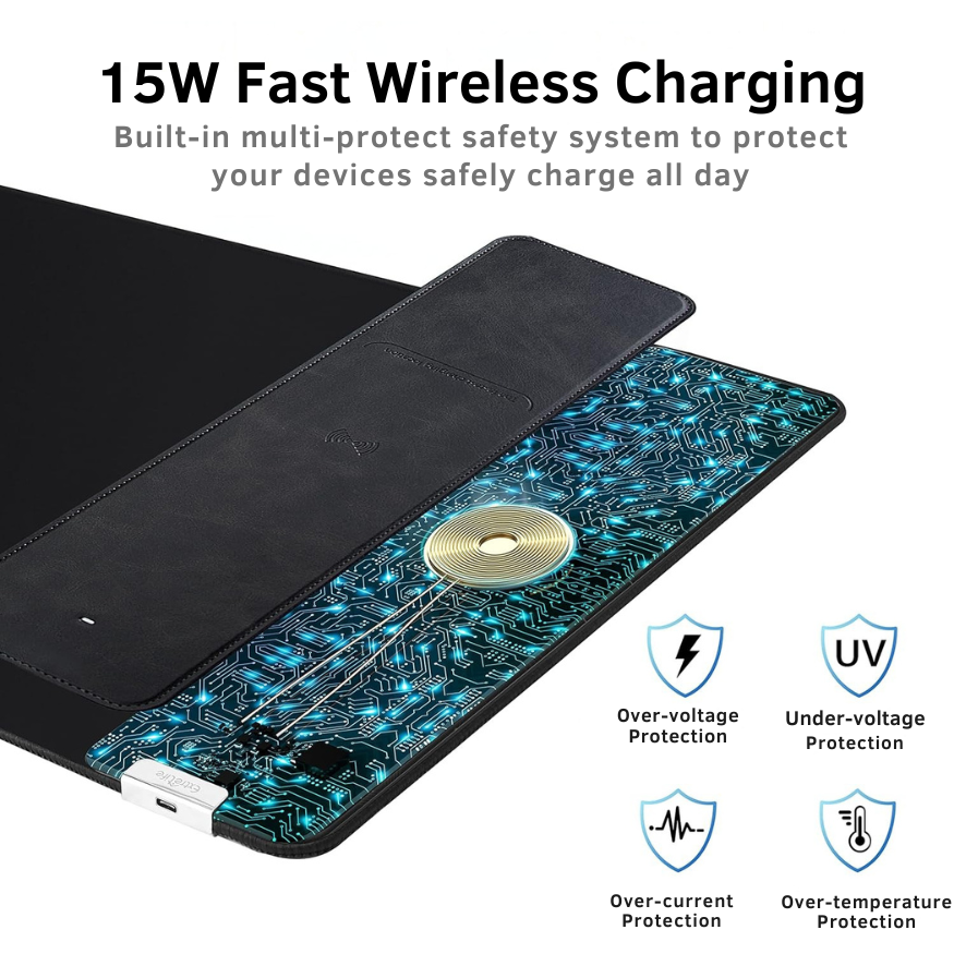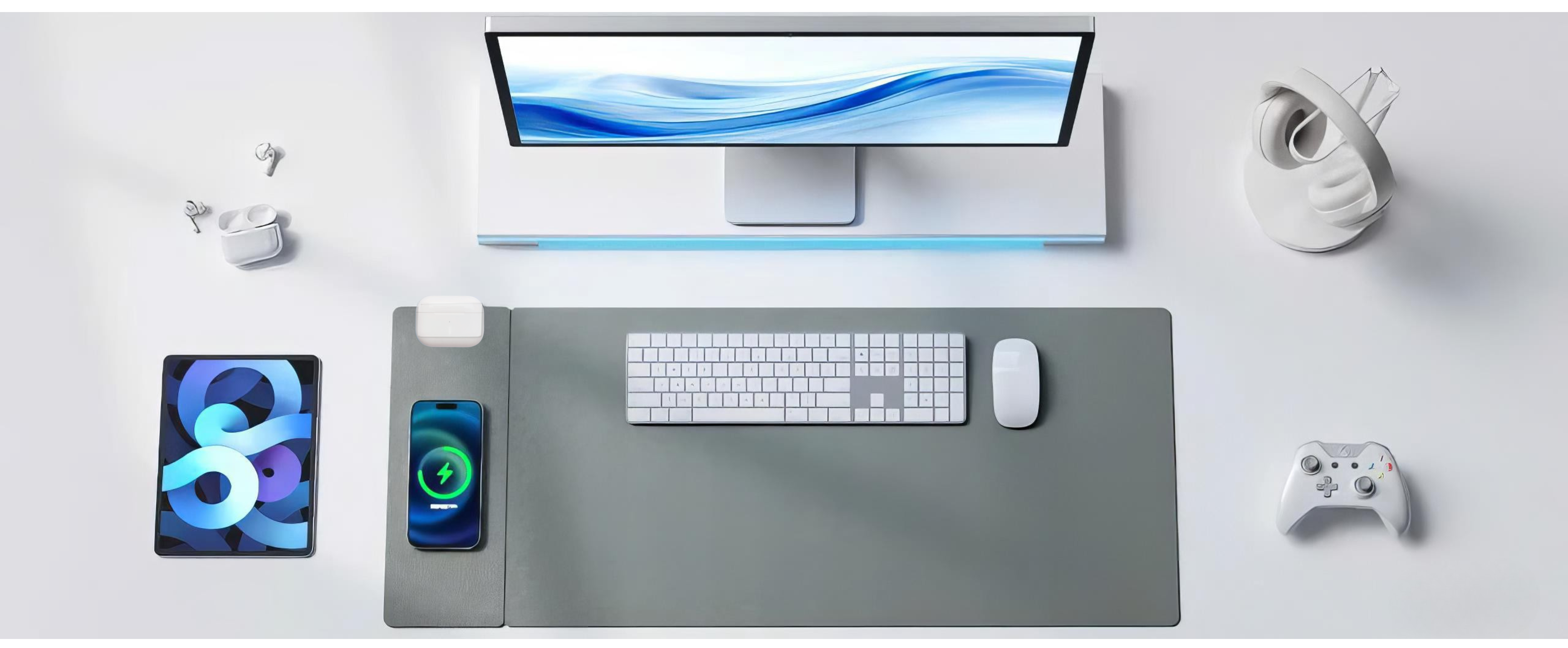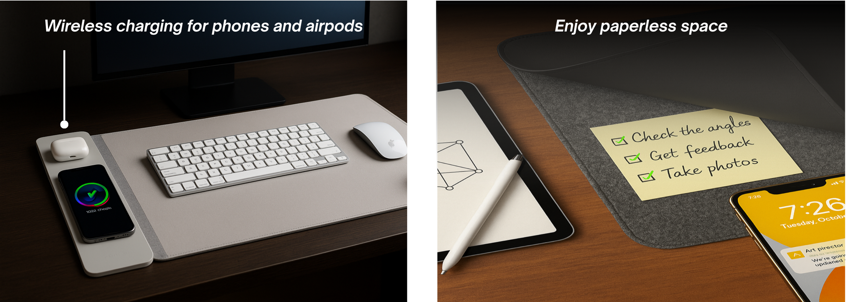 The dual-sided includes a built-in wireless charging surface that powers both your phone and earbuds simultaneously. Open it up to neatly store papers and notes — keeping your workspace clean and organized.